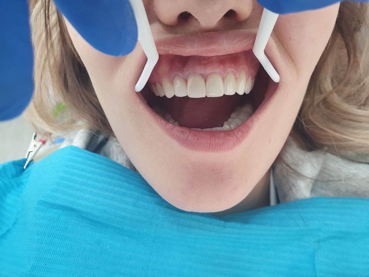 Пациентка обратилась с ранее установленными коронками в области четырёх передних зубов. Со временем конструкции утратили плотность прилегания, под ними развился кариес.