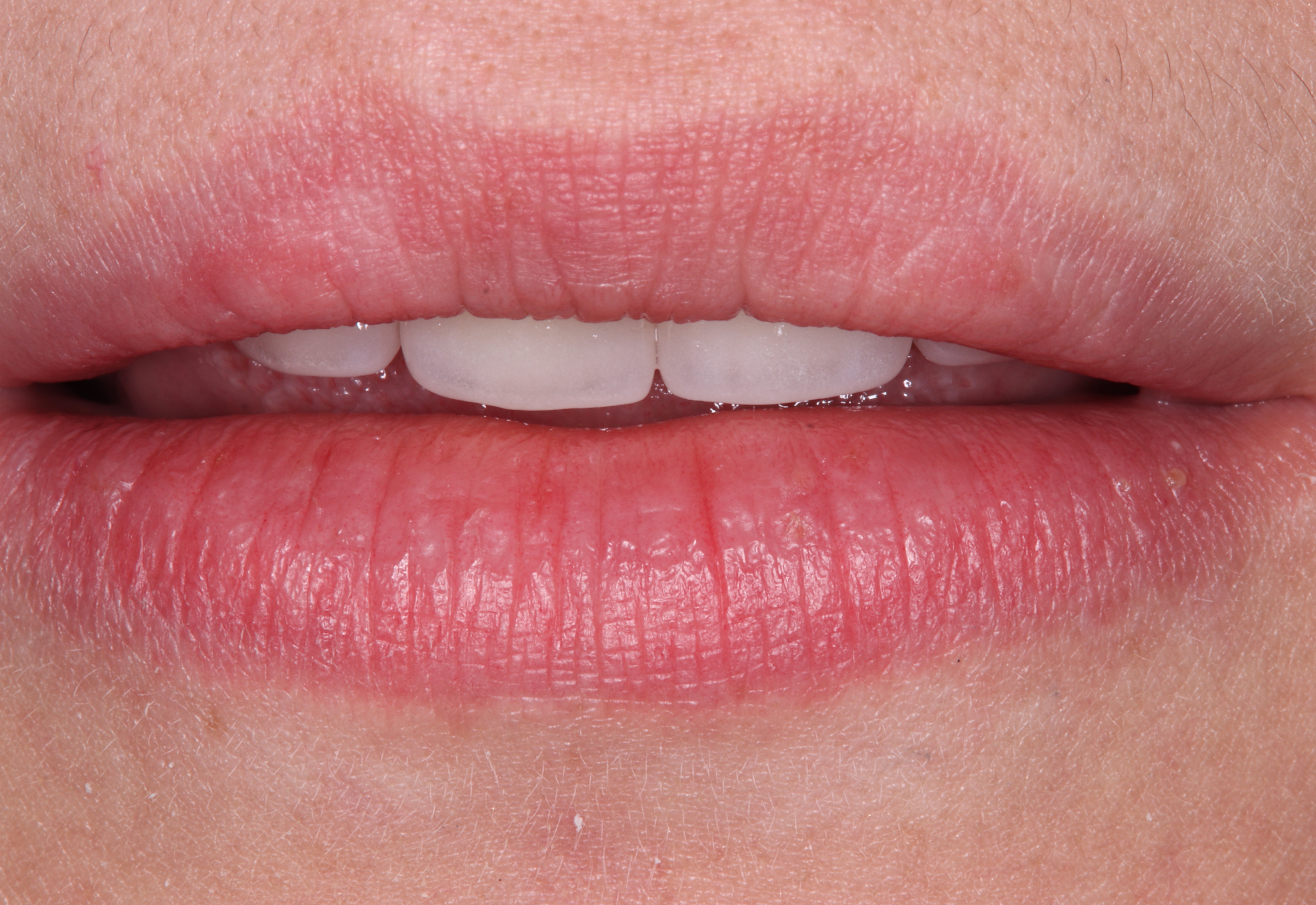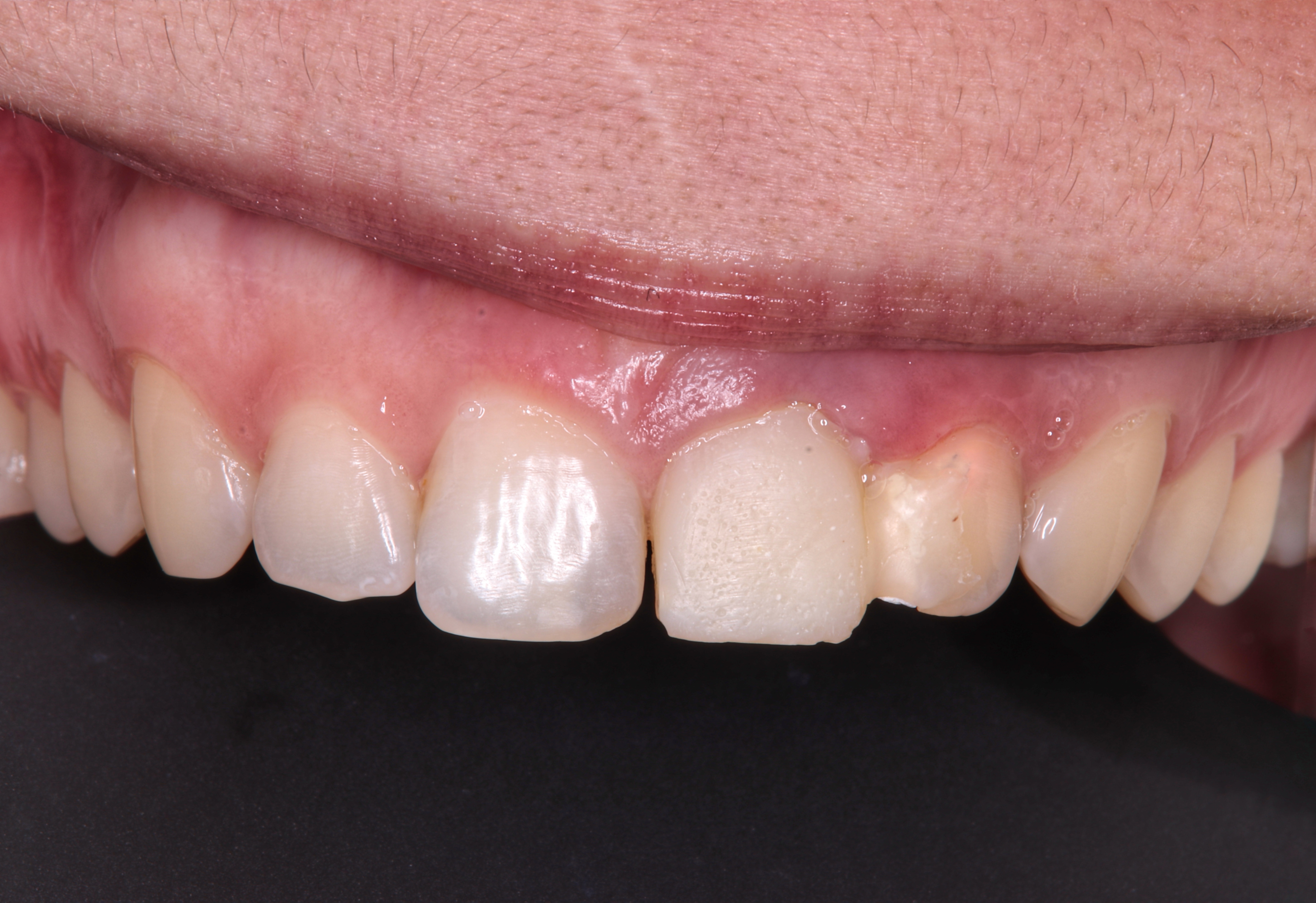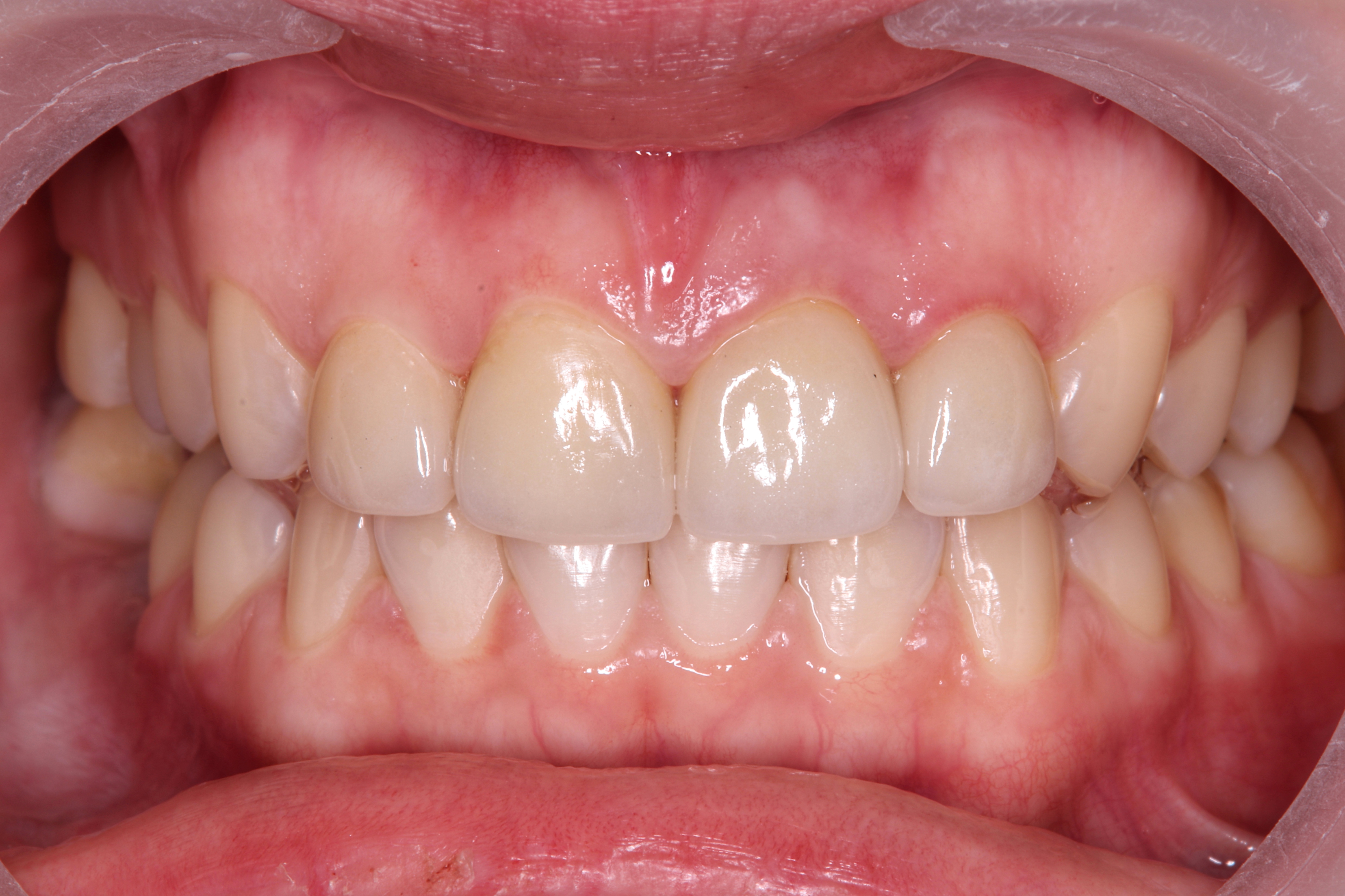 На центральный и правый боковой резец установлены виниры для восстановления режущего края и правильной формы зубов